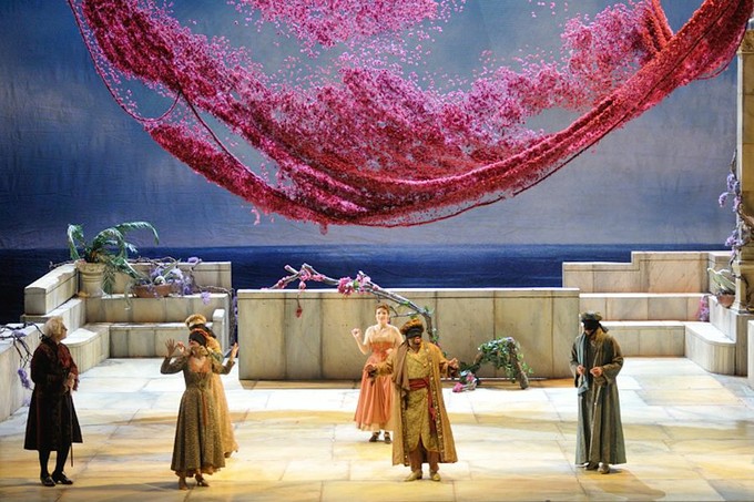 Далее начался процесс переодеваний — офицеров в «албанцев», а сестер — из траурных нарядов, надетых по случаю внезапного отъезда женихов, в восточные костюмы (они у мужчин и женщин сходны — шаровары, халаты, тюрбаны). В финале женщины остались в полюбившихся восточных «прикидах», а мужчины в смешанных — поверх мундиров халаты. И это, пожалуй, единственный визуально выраженный намек на то, что игра в соблазнение и измену на берегу ярко-синего нарисованного моря была не просто игрой, а мечтой, которая оставила по себе некоторую память. Периодически удивляло желание Дона Альфонсо умереть от смеха, о чем он без тени юмора сообщал по предписанному тексту, ибо далеко не всегда решение сцены давало к этому повод...