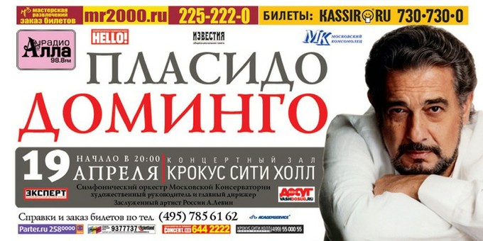 Мировая оперная звезда Пласидо Доминго назвал дату своего концерта в Москве. Встреча Доминго с российскими зрителями должна была состояться 19 апреля в концертном зале Крокус Сити Холл. Однако извержение вулкана в Исландии, закрытие европейского воздушного пространства сделали эту встречу невозможной. Организаторы концерта приложили максимум усилий, чтобы концерт в Москве состоялся в ближайшее время. В этом их активно поддержал и сам Пласидо Доминго, пообещавший в интервью корреспонденту ИТАР-ТАСС по возможности приблизить дату нового концерта. Окончательное решение о дате выступления в российской столице он принял в день своего очередного концерта в Милане, в Ла Скала, 21 апреля, практически перед самым выходом на сцену.
