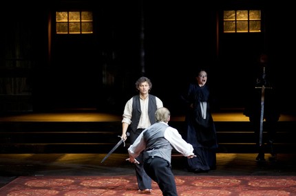 с аркадами во внутреннем дворе, где каждому хористу-брабантцу выделен квадратик, и старорусские поместья чеховских пьес с ностальгическими деревянными помостами возле водоема для Нины и Кости, и декорации фильмов Тарковского. Исключительно прекрасны оформление Кристиана Шмидта и свет Олафа Винтера.
