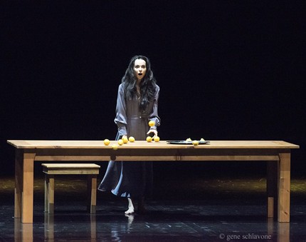 разрушив четвертую стену, разделяющую сцену и зрительный зал. В том самом волшебном столе нашлось множество лимонов, женщина режет их на половинки и угощает зрителей первых рядов. Солнечный цвет лимонов и щедрость героини настраивают на оптимистический лад.