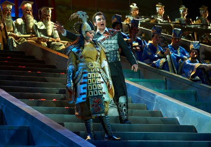 В московской «Новой Опере» Ахмеда Агади я услышал на премьере «Трубадура» Верди в середине декабря 2012 года, когда певец экстренно вошел в спектакль, заменив заболевшего исполнителя (к тому времени премьера «Турандот» в Казани успела уже состояться). По сравнению с практически белькантовой партией Манрико, в которой надо действительно много петь, много задействовать из технического вокального инструментария и много чувства вкладывать в роль на безупречной драматической кантилене, задачи партии Калафа несколько иные. И впечатление от нее, приобретенное в Казани, заведомо превосходит впечатление от партии Манрико. Этот тенор, которого я очень хорошо помню еще по его работе в Московском музыкальном театре имени Станиславского и Немировича-Данченко, всегда был заведомо лирическим по природе своего голоса. Однако с активным переходом в последние годы на партии драматического амплуа и в связи с небывалой востребованностью исполнителя именно в этом репертуаре, можно говорить лишь о благоприобретенной певцом лирико-драматической фактуре. Именно поэтому в драматических фрагментах партии Калафа певцу местами недостает вокального драматизма. Однако все «номенклатурные» номера этой партии – сольные эпизоды первого («Non piangere, Liù») и третьего («Nessun dorma») актов, а также сцену ответов на загадки Турандот певец проводит вполне зачетно, с немалым артистическим достоинством и убедительным ощущением чувства музыкального стиля.