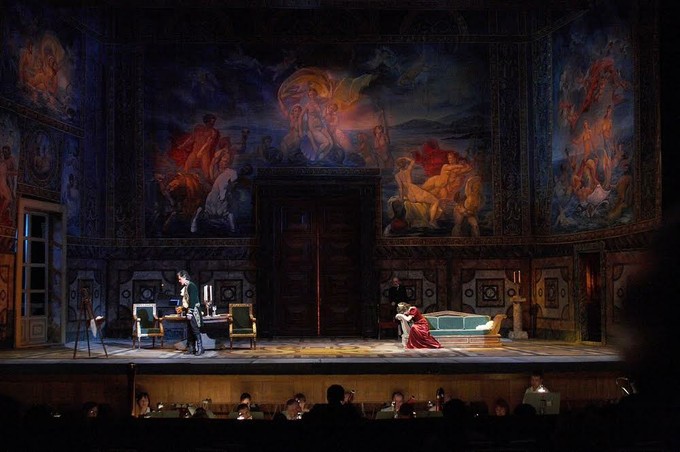 В начале второго действия, через открытую дверь в кабинет начальника полиции проникают звуки дивной танцевальной мелодии из соседней залы. Во время этого довольно продолжительного камерного эпизода, с солирующими флейтой и арфой, Скарпиа подходит к мольберту, берётся за кисть и пишет портрет любимой Тоски. По мнению режиссёра, он тоже художник. И наверное, это должно сближать Скарпиа с Каварадосси и вызывать симпатию у главной героини, чего на деле всё же не происходит. Да и актёрской игрой благородные черты личности, предполагаемые режиссёром, оказались поддержаны лишь формально.