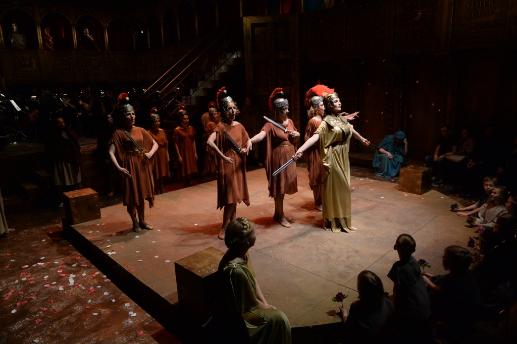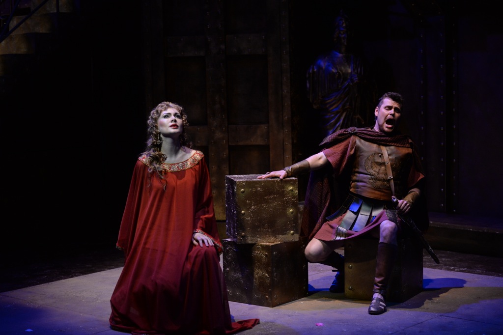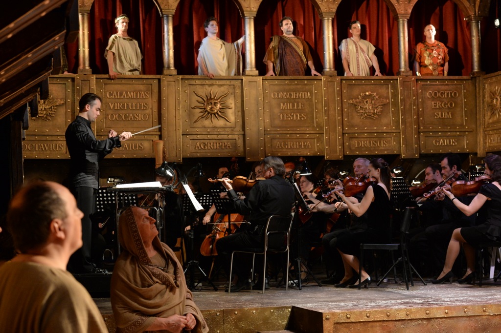 Первое – это спектакль для людей с крепкой здоровой спиной. В стремлении к аутентизму Камерный театр полностью перестраивает зал и сцену на серию представлений. Зрительские места – скамьи в античном амфитеатре, вздымающиеся полукругом, сидения обиты плюшем, но спинки только обозначены. Оркестр сидит вдали, на возвышении, боком к публике. Основное действие – на круглой арене, в шаге от первого ряда. Часто мизансцены переносятся на галереи – римские арки, обрамляющие зал по периметру. Лестницы, перила, балюстрада отделаны тщательно, хочется потрогать. Соблюдена фактура – старое тёмное дерево, бронза, крупная клёпка, надписи-щитки по латыни. Не всякая киностудия похвастает реквизитом такого качества! Ощущение погружения в материал, в Историю, не покидало весь вечер. Костюмы из натуральных тканей, бутафория, как реплики музейных экспонатов – хоть показывай школьникам на уроках про Древний Рим! Словно присутствуешь на съёмочной площадке исторического фильма, или принимаешь участие в модном сейчас реал-квесте про античность. За то сразу благодарность постановщикам: Ольге Ивановой и сценографу Виктору Герасименко. Хотя первым рядам пришлось за соучастие и погружение в действо расплачиваться излишней громкостью солистов, подчёркнутой заметностью грима и мимики. Да и артистам, уверена, не просто видеть глаза зрителей на расстоянии вытянутой руки.