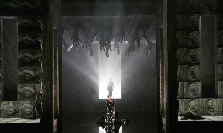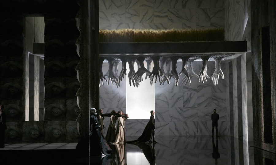 Сцена разделена на два соединённые проходом отсека, выстланные панелями с изображением многочисленных глаз и ушей — режиссёр как бы приглашает публику сделать усилие и напрячь эти органы чувств. Наличие двух полуавтономных пространств позволяет разнообразить действие, показывая параллельно жизнь сразу нескольких персонажей. В масштабных кульминационных сценах эти панели раздвигались, и глазам зрителей открывалось более обширный интерьер, выдержанный в духе строгого классицизма. А потолком у этого помещения было поле с колосящейся пшеницей, вместо корней у которой были руки с напряжённо растопыренными пальцами. В моменты, когда кому-то из персонажей грозила опасность, этот потолок опускался над ним, и руки пытались как бы схватить его и утащить в своё подземное царство.