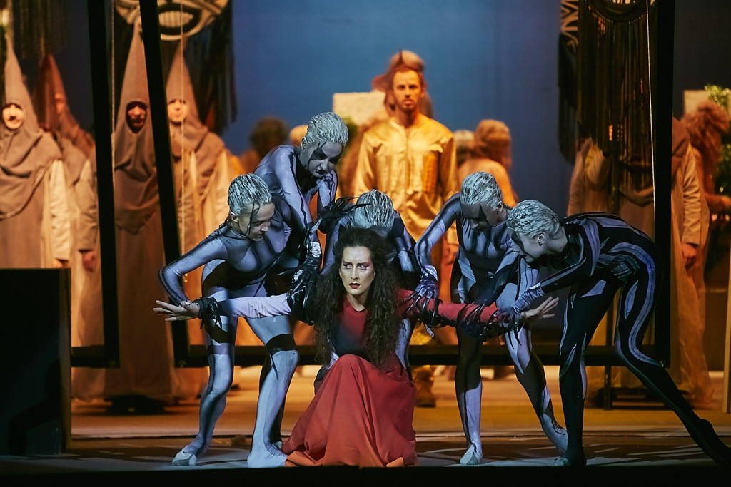 А вот на вопрос «зачем?» в этом – на сей раз в позитивном смысле – режиссерском театре пытается ответить кинематографическая составляющая спектакля. Специальный экранный клип-ряд предстает взору публики во время увертюры и симфонических прелюдий к идущим нон-стоп второму и третьему актам. Сразу оговоримся, в партитуре есть купюры. В основном, они коснулись партии Креонта и повторов хоровых страниц, однако все остальные музыкальные номера Керубини и практически все речитативы Лахнера сохранены. Это, конечно, не суть важно, но сравнение с московской постановкой-предшественницей показывает, что в Красноярске купюр в речитативах даже меньше.