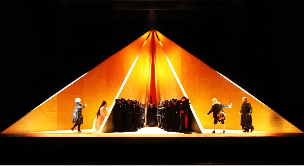 События первого акта происходят на корабле. Дизайнер сцены — британско-индийский скульптор Аниш Капур, один из наиболее влиятельных художников своего поколения, член группы «Новая британская скульптура», лауреат Премии Тернера. Рыцарь-бакалавр и член Королевской академии художеств, он представил нам «корабль», разделив сцену на три фрагмента огромными, на всю высоту сцены, деревянными перекрытиями, лучом сходящими где-то там, в глубине сцены. У меня лично осталось ощущение стремительно летящего корабля, под «парусами» которого (даже если и деревянными), и на его палубах перед зрителями предстают два группы героев, слева — Изольда и ее решительная Брангена, справа — Тристан и его верный Курвенал. Наделенные гротескными комическими чертами и служанка, и слуга, они оба, преданные до последнего вздоха своим господам, оживляют первый акт, снимая напряжение, разбавляя драму милыми и глупыми деталями. Но если Он, доверенный рыцарь короля Марка Корнуоллского, и Она, ирландская принцесса, сосредоточены на пении, то их слуги позволяют — каждый на своей половине — «милые шалости», соблюдая неимоверно сложные по обряду одевания своих героев, тем более что — деталей их одеяний нескончаемо, а атрибутика — замысловата. Только сейчас, полюбопытствовав, сколько же времени длился первый акт, узнала цифру — 80 минут! Не заметила! Общее впечатление первого акта — напористо, эмоционально, экстатически, мучительно и — прекрасно!