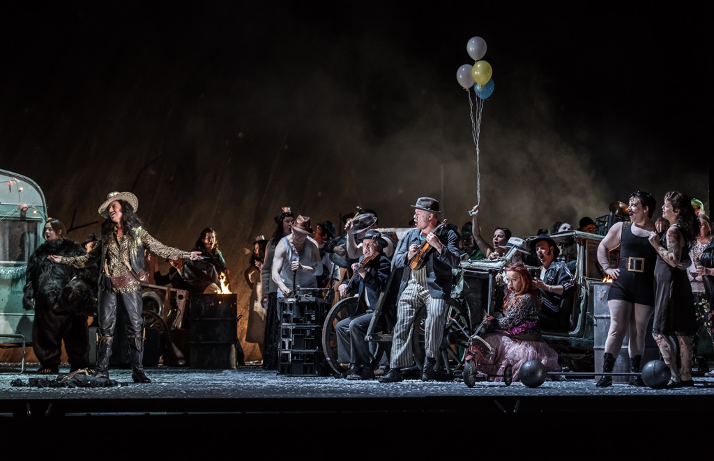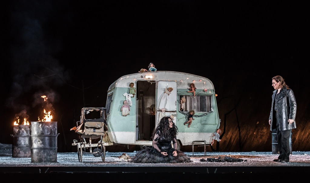 Декорации (сценограф Патрик Банварт) – как в какой-нибудь детской страшилке. Пред нами ведь – «черная опера». Так вот, на совершенно черной-черной сцене – убогие черные деревца (это, по идее, должен был быть сад перед дворцом Леоноры), припорошенные легким снегом, на одном из которых во втором акте Леонора игриво вырезает ножичком «Л + М = сердце»; периодически на сцену выползает черный-черный танк – на нем белой краской наляпано – «Луна». Вокруг кольца оборонительной черной колючей проволоки, черные кресты… Некоторое цветовое разнообразие привнесено во втором акте, когда на мрачной сцене появился цыганский табор и караван, украшенный куклами. Один образ – старика-цыгана с крыльями ангела под прохудившимся черным зонтиком – почему-то запомнился.
