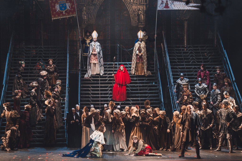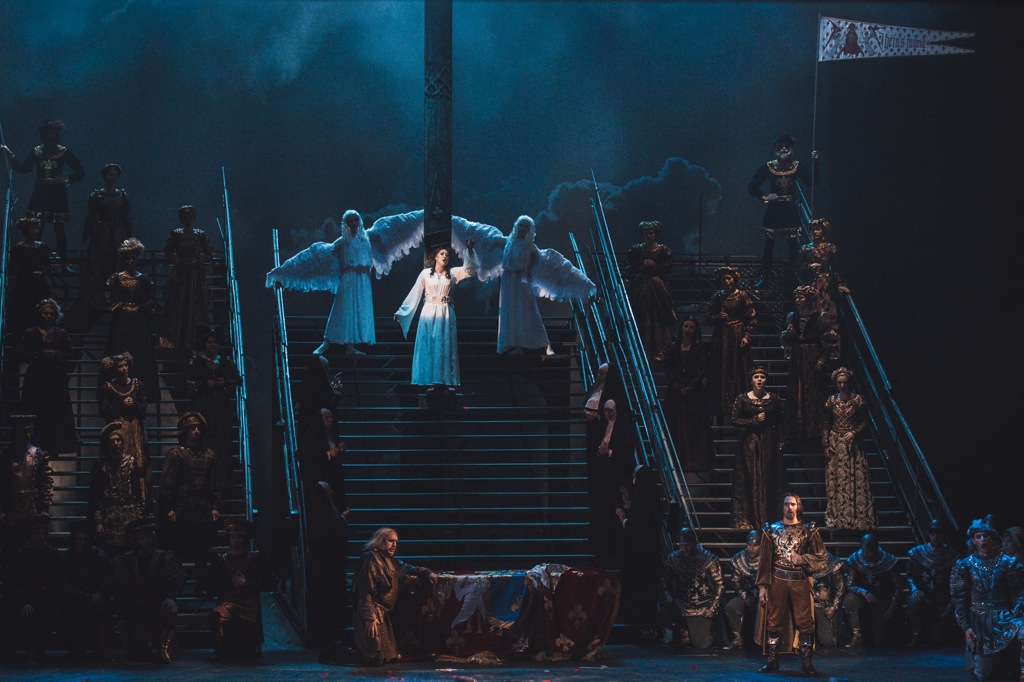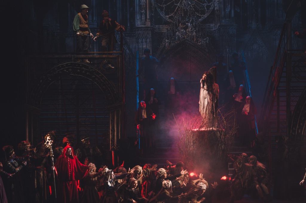 По отношению к аморфно-иллюстративной постановке в Милане динамично-яркая, захватывающая своей зрелищностью и ясным психологическим наполнением постановка в Ростове-на-Дону – полная противоположность. Ростовская версия вполне традиционна и классически строга. При всей сценографической абстракции театрального воплощения она несет на себе черты живописнейшей монументальности. Это и досконально продуманные, действенные мизансцены. Это и потрясающе стилизованные под эпоху французского Средневековья костюмы. Это, наконец, изумительная постановка света, массовых хоровых сцен и пластико-хореографических эпизодов. Хореографии отдано на откуп потустороннее измерение – как небесно-райское (мир ангелов и духовного света), так и инфернальное (мир демонов и искушающих соблазнов).