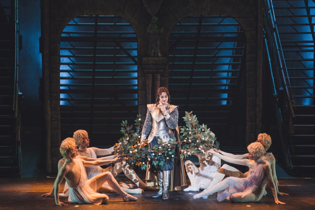 Вторая картина первого акта в садах дофина в Реймсе – предвестница кульминации финала в сцене коронации второго акта. После полного сомнений и тревоги романса главной героини, робко примеряющей на себя первые лавры девы-воительницы, любовный дуэт Жанны и Карла – самое провокационное и самое уязвимое место во всей драматургии оперы, но гений Верди находит для нее весьма убедительные музыкальные интонации, а режиссер совместно с хореографом – очень точное психологическое решение. Кажется, что силы ада и тьмы действительно овладевают душой Жанны, когда она, терзаемая дьявольскими голосами и мучимая странным видéнием старика, желающего ей смерти, в изнеможении падает ниц.