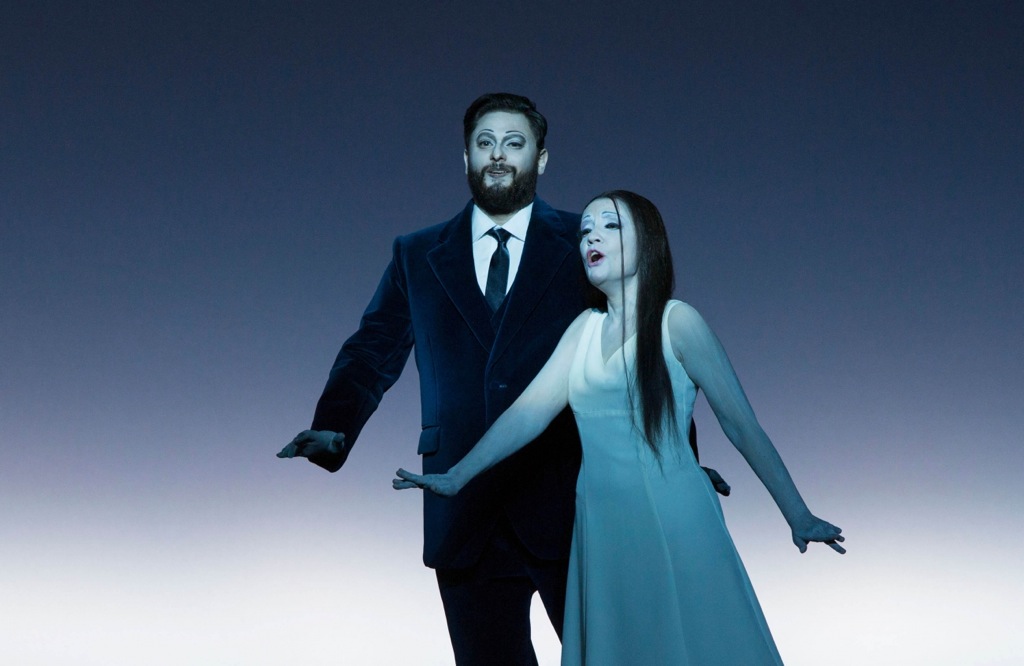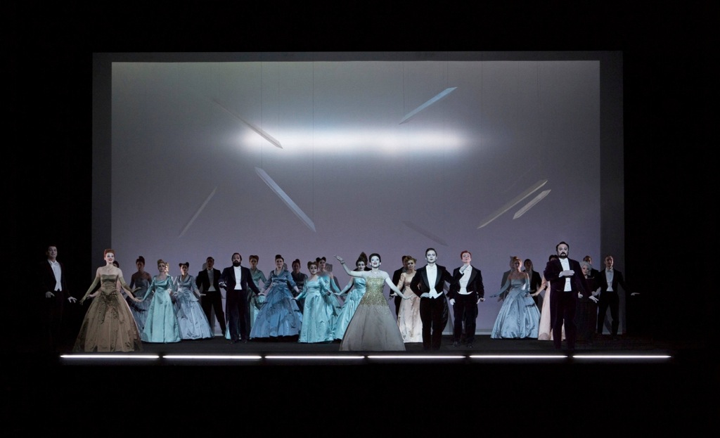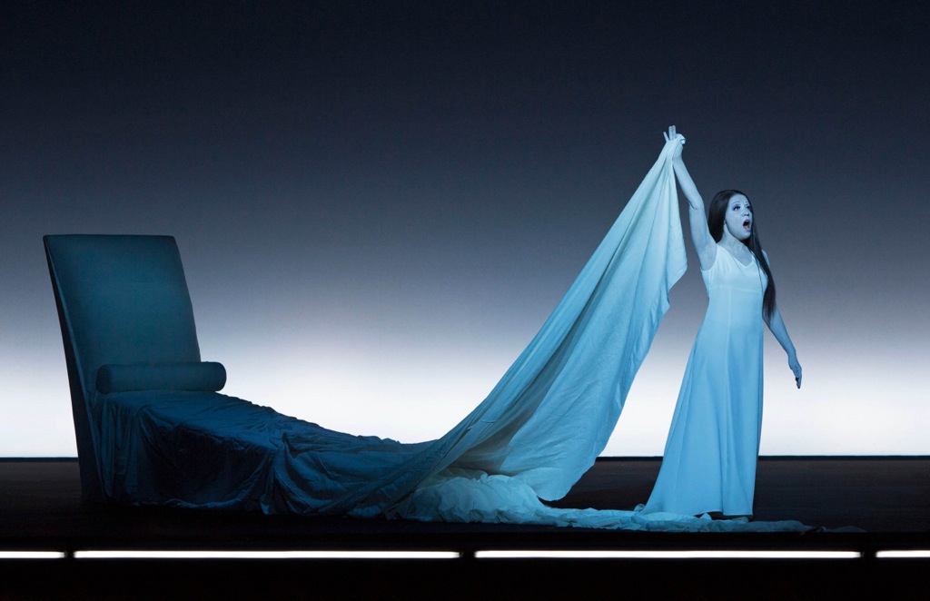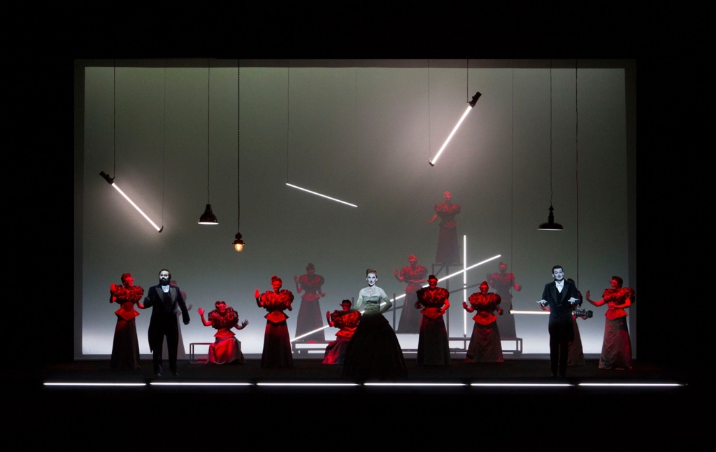Что касается смыслов, вложенных в постановку, то и тут можно найти полное взаимопонимание режиссёра и музыкального руководителя. Курентзис, говоря об этой истории женщины, прошедшей путь от куртизанки к подвигу материнской жертвенности, использует достаточно расхожие штампы, и самым интересным ему – вполне ожидаемо – кажется музыкальное взаимодействие Виолетты с Жоржем Жермоном, особенно если заглавную партию исполняет певица по возрасту с ним сопоставимая. Зато во всем, что касается интерпретации им музыки, ни о какой скучной банальности и речи быть не может. Постановка Уилсона тоже не несёт в себе абсолютно ничего нового по смыслу, тем более не шокирует, даже не удивляет. Она идеальна совершенством стиля, невероятно красива своей декоративностью и стерильна с точки зрения декораций. Нет никаких предметов, даже письма и медальона. Кажется, что главное действующее лицо постановки – это свет. Его много, и он очень разнообразен по представлению: зарево, неоновые трубки, которые благодаря боковому механизму запуска сильно смахивают на джедаевские мечи, традиционные подвесные светильники, направленный свет. Освещение то полыхает заревом голубого экрана общего фона, то выхватывает руку, лицо, поворот скулы – это очень фокусирует внимание и создает важные акценты – холодная яркость неона первой сцены, кровавый отблеск бала у Флоры, танцующая бледность руки в отголосках карнавала и выхваченная мертвенная маска последней картины. Направленный на Виолетту луч гаснет – она умерла.