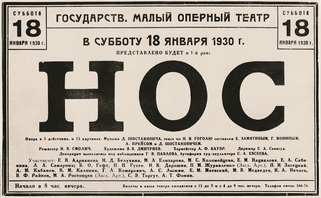 «Нос» Дмитрия Шостаковича по одноименной петербургской повести Гоголя сочинялся в период повального увлечения западной музыкой, поэтому глубокое заблуждение считать, будто бы язык оперы ошеломил современников новизной и оригинальностью. Ленинградский зритель был достаточно просвещен и основательно подготовлен в отношении нового музыкального языка. Стиль Шостаковича формировался в период экспериментов и настойчивого ожидания от советских композиторов новых революционных произведений. Поэтому, опера «Нос» вызвала в театральном сообществе резонанс, ведь, наконец, появился советский композитор, способный сочинить музыку, не уступающей западноевропейским новинкам. Шостакович неоднократно выступал на обязательных для того времени рабкоровских сходках и разъяснял собравшимся замысел «Носа», а так же, комментировал необычный музыкальный язык оперного произведения. «Нос» создавался урывками на протяжении года, и полтора года принималось решение о постановке оперы на сцене МАЛЕГОТа.