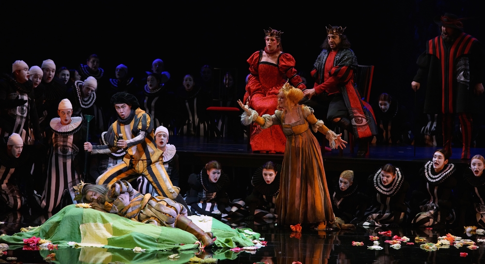 В неразрывной «связке» со сценографом и автором костюмов творит режиссер Оливье Тамбоcи. Cекрет совершенства спектакля в умной, часто геометрической разводке мизансцен и тщательной работе с певцами-актерами. У Тамбоси нет ничего случайного, каждый артист хора знает свое место и точно его соблюдает, как каждый солист знает каждый жест и необходимое на данный момент выражение лица, понимает как ему взаимодействовать с партнером. Визуальному совершенству мизансцен способствует расстановка мебели: столы могут быть расставлены поначалу длинной стороной к зрителю, а в последующий момент короткой, стулья параллельными или по диагонали, персонажи ведут диалоги друг с другом, когда один из них находится на столе, а другой на полу. Геометричность «картинки» гармонирует с одинаковыми костюмами хора, который весьма напоминает кордебалет, а стиль спектакля в чем-то сродни классическому балету второй половины девятнадцатого века.