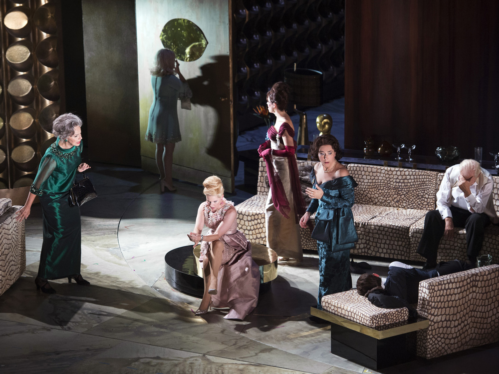 По признанию самого композитора, форма вальса использована в опере как основной символ замкнутого круга, в которой музыкальная тема лишена внутреннего стремления к разрешению, к завершению, к финалу. Сценографическим символом этой невозможности людей вырваться из замкнутого пространства становится гигантская арка из красного дерева, инсталляции из панелей красного дерева, из «золотой» стены, высотной панорамы на современный город, дорогой мебели и аксессуаров переносят нас в мегаполис 60-х-70-х годов прошлого века (сценограф и художник по костюмам - немецкая художница Хильдегард Бехлер). За пределы арки не может проникнуть никто, даже живой медведь. И только чудом героям спектакля удаётся заманить к себе в столовую бедную овцу, которая и становится жертвой уже совсем озверевших от непонимания ситуации людей, готовых пойти не только на самоубийство, как Эдуардо и Беатрис, но и на убийство тех, кого легко обвинить в своей собственно, сугубо личной проблеме. И вот в самый критический момент, когда уже сорваны не только социальные маски, но и даже ничего человеческого в героях оперы не остаётся, певица Летиция вдруг замечает, что на пороге страшного саморазрушительного преступления все гости званого ужина оказываются на тех же самых местах, на которых были в момент возникновения абсурдной ситуации с невозможностью покинуть помещение столовой комнаты. Именно Летиция как человек искусства и как оперная прима предлагает попробовать повторить всё заново, то есть заново проиграть тот вечер, во время которого возникла страшная для понимания психологическая блокада.