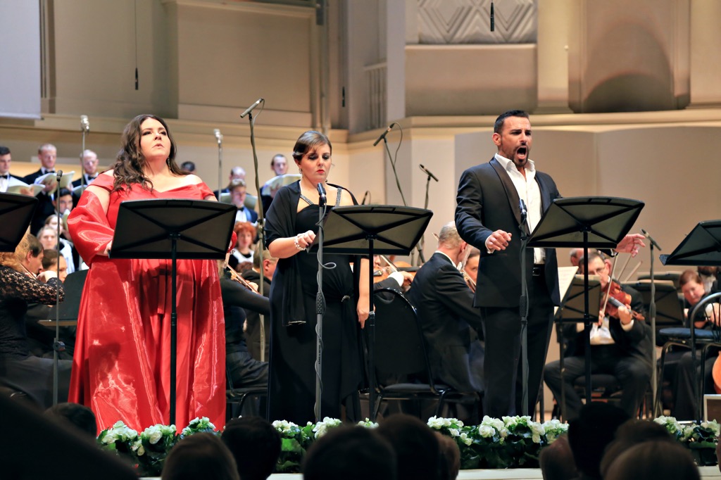 Каждый из музыкальных «приветов» был незабываем и неповторим, но четвертый, последний из них, произвел на меня, пожалуй, самое сильное впечатление. Закономерен вопрос: почему? Если говорить только об операх, то первые живые открытия и «Танкреда», и «Семирамиды», и «Гермионы» для автора этих строк связаны именно с фестивальными постановками в Пезаро. В этом списке «Гермиона» образца 2008 года с дирижером Роберто Аббадо была последней, и, будучи весьма компактной по структуре музыкальных номеров, своим психологическим саспенсом и драматическим напряжением на единицу сценического времени, она, кажется, просто зашкаливала! Во всяком случае, первое впечатление было именно таким, и на нынешнем концерном исполнении в Москве это мощное эмоциональное ощущение вдруг вернулось ко мне вновь. Это и есть ответ на вопрос, заданный самому себе выше.