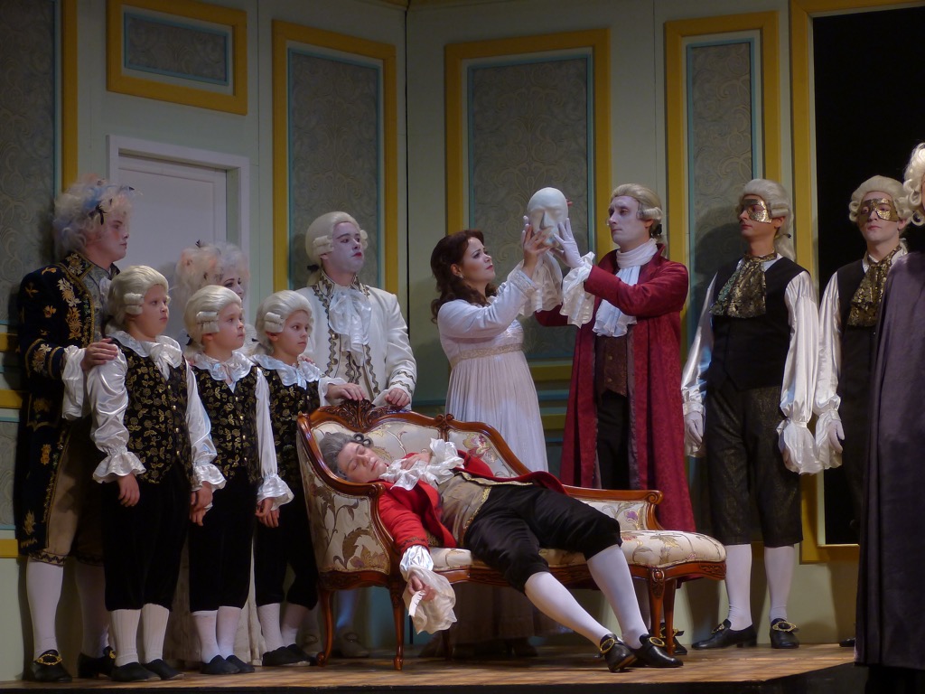Вплетаясь в ткань моцартовского зингшпиля, комментируя и проясняя по ходу дела многие сюжетные моменты, лекция-экскурсия в докучливое назидание не превращается, а визуализация двух дополнительных слоев – музейно-экскурсионного и семейного – с развитием основной оперной фабулы уживается мирно, бесконфликтно. Постепенно мы начинаем понимать, что сам Моцарт (мимический персонаж в исполнении Михаила Семенова) ассоциируется и с благородным принцем Тамино, и с простодушно добрым, обаятельным Папагено: они – словно две его светлые ипостаси. В противовес им мавр Моностатос – символ «черного человека», заказавшего Моцарту «Реквием».