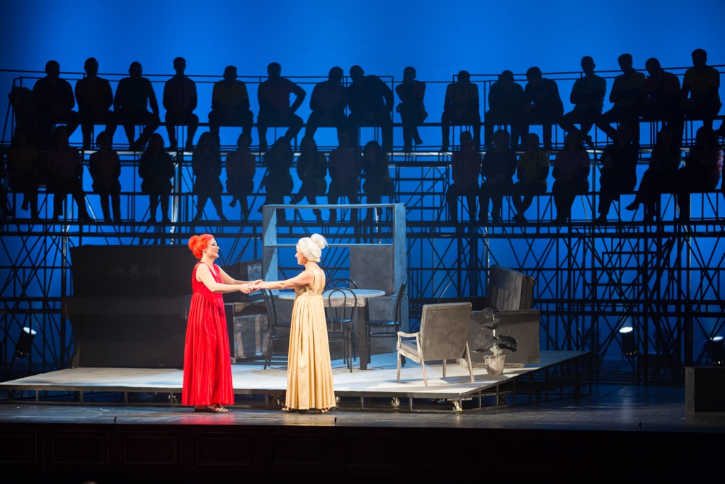 В особую «монолинию» превращается партия Лихаса (конфидента Деяниры). Хор в этой оратории Генделя подобен хору комментатора-резонера в древнегреческой трагедии, но зачастую комментатором событий выступает в своих монологах и Лихас. В отличие от «галактической» сценографии «Волшебной флейты», в «Геракле» мы словно оказываемся в ядре галактики под названием «Семья», на которую с высоких конструкций-лесов, словно с небес взирает хор. Крутящийся островок сценографии на наклонном подиуме – хрупкий маленький коммунальный мир семьи Геракла. И он сразу же начинает трещать по швам, когда на ту же жилплощадь Геракл своим волевым решением «прописывает» Иолу.