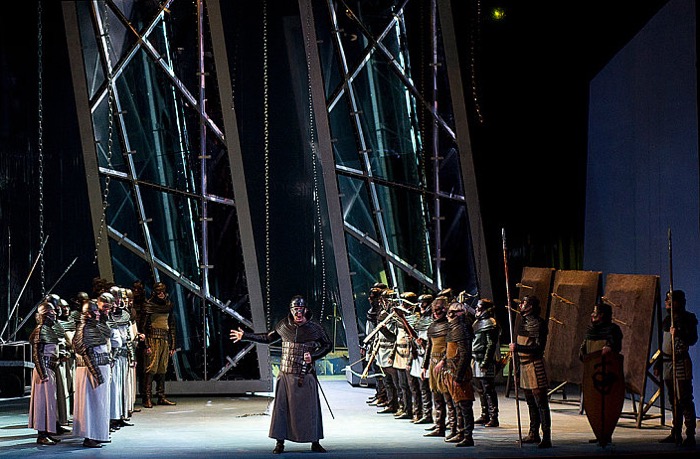 О постановке, премьера которой состоялась 16 декабря 2012 года, наш журнал уже неоднократно писал, поэтому добавлю только несколько слов от себя. Команда европейских специалистов (музыкальный руководитель Ян Латам-Кёниг, режиссер Марко Гандини, сценография Итало Грасси, костюмы Симона Моррези, свет Вирджинио Леврио) сделала постановочно-нейтральный продукт, очень удачно расположившийся ровно на середине дороги от «нафталинового реализма» к «радикальному осовремениванию». Световые конструкции в нем схематично замещают декорации, а костюмы и визуальные решения персонажей – скорее, в духе фэнтези с историческим уклоном, нежели правдиво исторические: доспехи воинов из объемной кожи, цыгане – просто абстрактные сказочные разбойники или бродячие циркачи в зеленом, цыганки – атлетичные, в топиках и легких брючках (чего категорически не могло быть ни в исторической Европе, ни в мусульманском мире), Леонора в финальной сцене появляется в кожаном платье и замшевых ботфортах, монахини ходят в нежно-розовых одеяниях, а Азучена не покрывает голову с коротко остриженными седыми волосами и тяжело ступает по сцене, поднимая руки, как будто удерживая равновесие. Последний образ в некотором роде перенастраивает и драматургию: вид и поведение старухи дают четкие ассоциации с безумием, в ней мало материнской любви и совсем нет заботливости. Как итог, герои де факто ценой своих жизней обслуживают навязчивую идею Азучены про подмененного и сожженного младенца. Путанность сюжета при таком раскладе перестает быть недостатком либретто, а оказывается весьма даже к месту – цыганка сама толком не понимает, что она вспоминает, что приврала, а где и вовсе галлюцинации, но сын, тем не менее, обязан делать и принимать на веру то, что считает нужным теряющая рассудок мать.