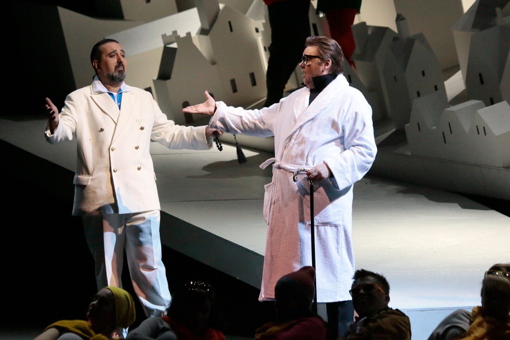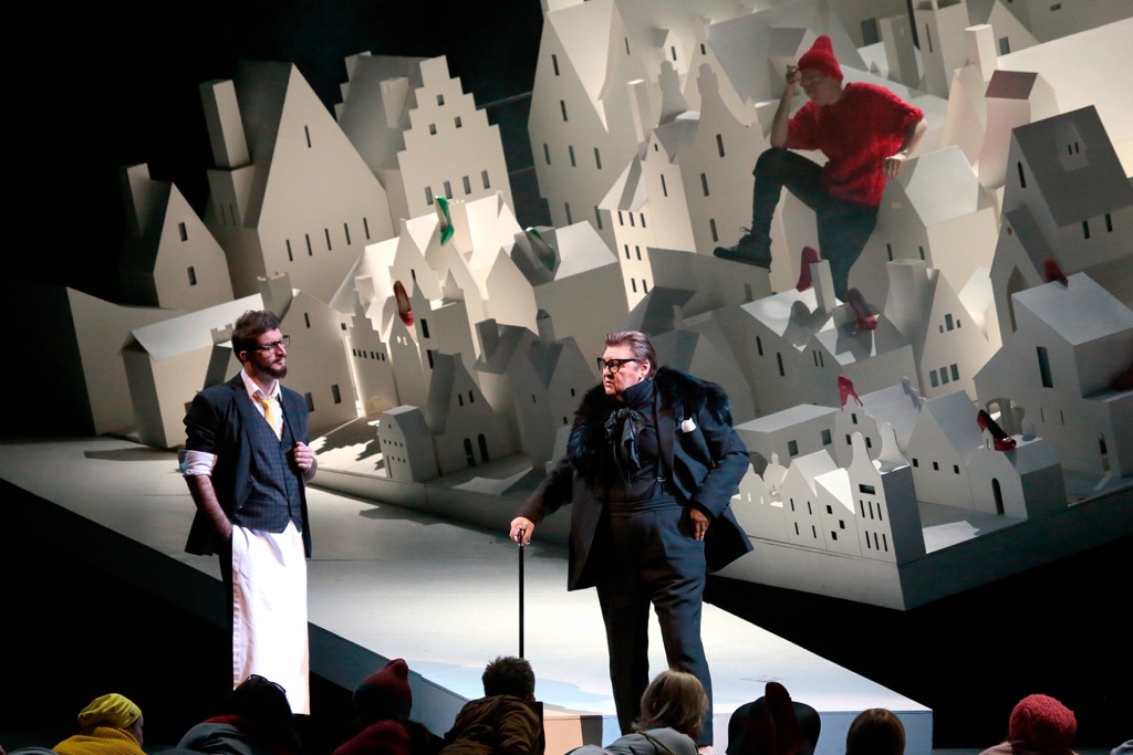 Первый акт – «белый», все еще чисто и невинно. Забегая вперед, скажем, что вообще черный и белый в спектакле – это отнюдь не банальные знаки чистоты и порока, добра и зла или ян и инь. Все гораздо запутанней, злодей Жеронт надевает белый гостиничный махровый халат, а воссоединившиеся в финале любящие герои, напротив, все в черном. Городок Амьен представлен как белый бумажный макет на наклонной плоскости, из труб иногда идет открыточный дымок, в окошках по-новогоднему зажигаются огоньки. Путешественники летают на уменьшающихся вдали подсвеченных воздушных шарах. Местное население-хор ходит в ярких вязанных колпачках – не то сказочные гномики, не то современные московские юные волонтеры на каком-нибудь «креативном» мероприятии (скорее, второе – гламурные туфельки, которыми играют хористки, для гномов нехарактерны). Красненький Эдмон тоже в колпачке и коротких штанах скачет как Буратино, Манон в белом платье с пышной юбочкой и белом же колпачке держит в руках куклу, одетую точно так же, как она. А вот де Грие, пробирающийся среди кукольных домиков в темном сюртуке, на этом фоне выглядит слишком серьезным, взрослым и настоящим – он и выплескивает на бедную Манон всю серьезность своего чувства сразу.