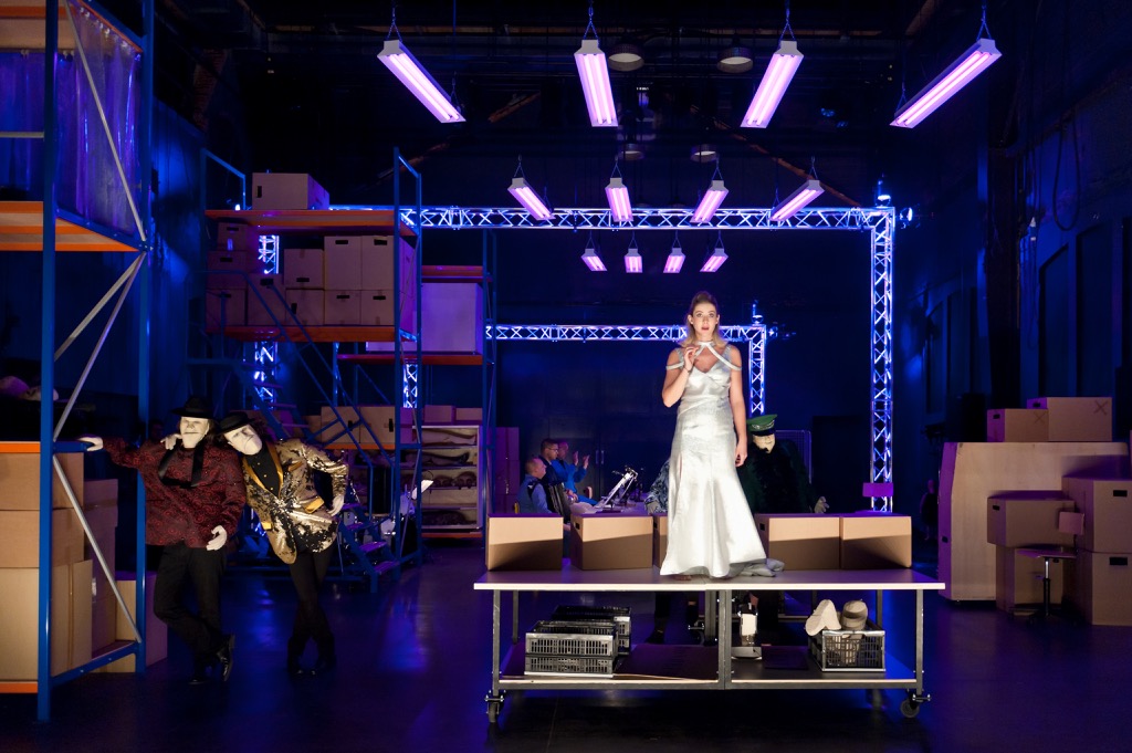 Декорация, придуманная Лизой Наварро, — нечто вроде ангара промзоны, наподобие, скажем, склада в «Икее» — быстро и эффективно преобразовывалась по мере надобности то в конюшню, то в полицейский участок, то в бордель и т. д. Важным структурным элементом этого сценического пространства был узкий и длинный стол, повёрнутый торцом к зрителям и разделявший площадку на две равные части. За столом этим сидели музыканты, которые принимали участие в спектакле на всём его протяжении, изображая то рабочих на «фабрике» Пичема, то гангстеров, то полицейских, то клиентов в публичном доме… Жан-Робер Лэ дирижировал ими, одновременно играя на трубе, — как это было принято во времена биг-бэндов.