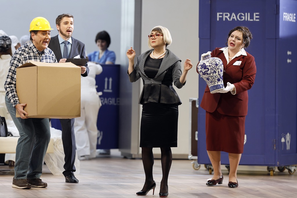 Остальные работники «Золотой лилии» – обслуживающий персонал (уборщики, грузчики, монтажники). Эту сферу представляет именная тройка работников (Дзефирино, Антонио и Джельсомино), а также хор – такой многочисленный и трудолюбивый, что от него порой даже рябит в глазах. Одним словом жизнь в галерее кипит: одни картины упаковываются, другие готовятся к экспозиции, кругом – суета сует. Но до антракта, еще не понятно, что делают здесь бывшие «знатные» постояльцы (пока не названные). Среди них – четверо французов: модница Графиня ди Фольвиль, ее служанка Модестина и ветреный кузен Дон Луиджино, а также любвеобильный офицер – Кавалер Бельфьоре.