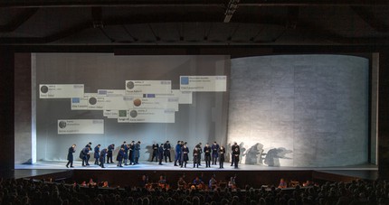 А. Кригенбург — режиссёр пространства, который всегда игнорирует текст, но всегда «учитывает» музыку (его мизансценные решения исключительно музыкальны). В результате мы видим прекрасную лаконично-грандиозную инсталляцию с видеопроекциями моря (море — это всегда хорошо) и твит-чатов, посвящённых историческому избранию первого лица Генуи. Твит-чаты на итальянском, что аутентично, но неудобно, отчего их смысл для целевой аудитории бесперспективно ускользает (мне пришлось несколько раз объяснять бабушкам и дедушкам, приехавшим на спектакль, о чём там речь).