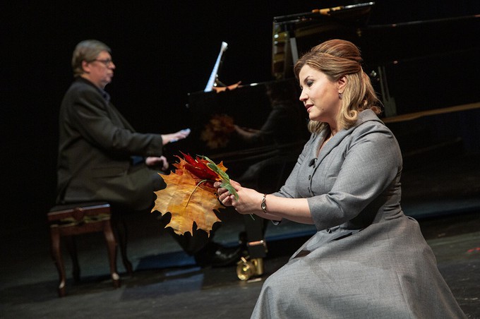 По крайне лапидарным данным программки, премьера петрозаводского «Ожидания», неожиданно привезенного в Москву, состоялась 12 октября 2013 года, однако об авторах постановочно-сценографической концепции в программе нет ни единого слова. На сцене слева – «рояль в кустах» воображаемого парка, справа – парковая скамейка, одинокая, как и сама героиня. «Упавшие» на рояль и планшет сцены разноцветные листья говорят об осени. Кажется, еще тепло, ведь героиня – не в пальто, а в скромном сереньком платье, но встречаем мы ее не по одежке, а по красоте души – по уровню музыкально-артистического перевоплощения, что и заставляет пролететь полчаса спектакля, словно один миг…