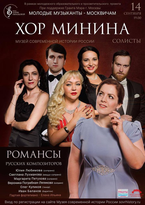 Фонд Елены Образцовой в рамках проекта «Молодые музыканты — москвичам» представляет концерт солистов Московского государственного академического камерного хора. Концерт пройдет в Главном здании Музея современной истории России (бывшем Английском клубе). Адрес: Москва, ул. Тверская, 21.