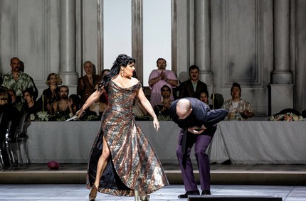 Совместную постановку Пасхального фестиваля в Зальцбурге, Королевского Оперного дома Ковент Гарден и Афинской Национальной оперы осуществил руководитель Королевской оперы Оливер Милс. Режиссёр оставил венецианский антураж в форме узнаваемых аркад и пирсов (сценография Филиппа Фюрхофера), но перенёс действие в наши дни, превратив венецианское население в безвкусно одетую толпу круизных заокеанских туристов в грубых шортах и летних рубашках (костюмы Аннемари Вудс).