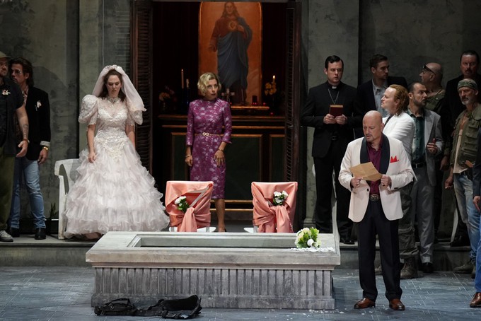 Мы видим, как два враждующих наркокартеля, две мафиозные «семьи» объединяются в противостоянии спецподразделению по борьбе с наркотиками, бойцы которого зрелищно захватывает мафиозное логово в конце третьей картины II акта и потом убивают Танкреда, который в новой версии является не мужчиной, поющим женским голосом [2], а женщиной по имени Танкреди [3].