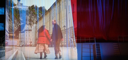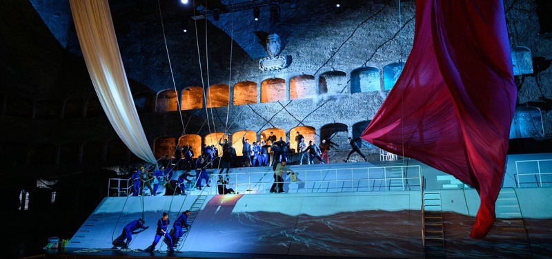 Драгоценным компонентом спектакля является сложная сценография Штефани Зайтц, главным решением которой стали видеоинсталляции с изображениями разных состояний морской стихии – от дождливой ряби до лучезарного штиля. Это логично и эстетично и подчинено созданию живого, дышащего пространства, в котором, впрочем, не так просто существовать вокальному ансамблю. И здесь нужно отметить прекрасную работу хора Земельного театра и Венского хора Филармония.