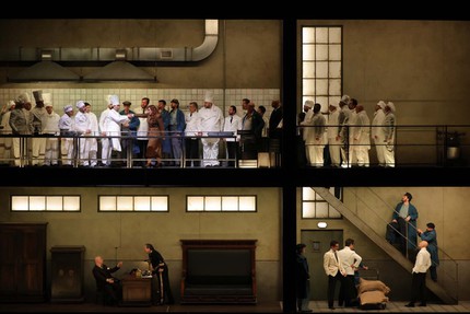 Из первой левой кулисы периодически выезжает двухуровневая конструкция из горизонтальных павильонов, соединённых лестничным пролётом и изображающих кухню, в которой трудятся повара (там же они будут издеваться над официантской Аксиньей, поливая её майонезом и посыпая мукой), и кабинет руководителя с характерными для той эпохи монументальным кожаным диваном, шкафом и сейфом, в котором любовник Катерины повар Сергей спрячет потом труп мужа Катерины Зиновия Борисовича.