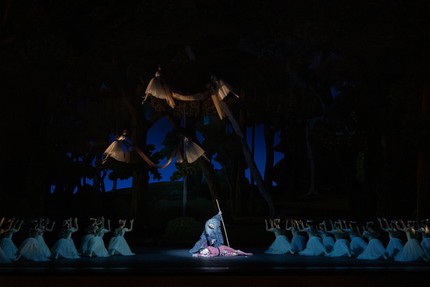 Кордебалет Баварского государственного балета — один из ключевых факторов успеха спектакля. В первом акте он функционирует как живая социальная среда. Во втором акте кордебалет становится телом воздуха; синхронность и чистота линий, единый темп дыхания создают ощущение непрерывного потока. Сценические механизмы и технические решения в оформлении Пьера Сисери работают здесь как трюковое средство усиления пластической иллюзии.