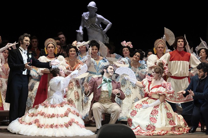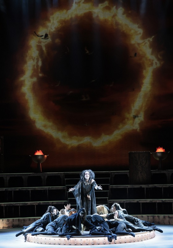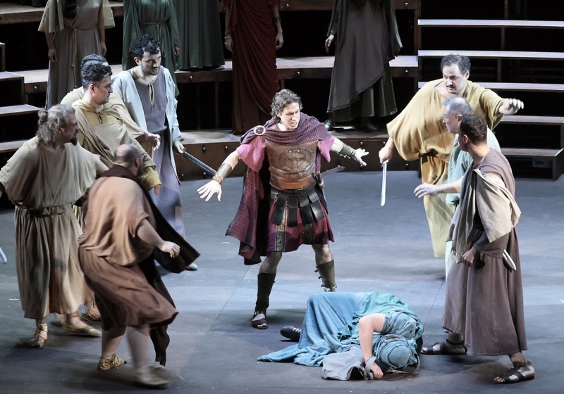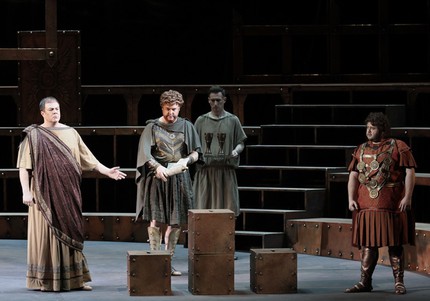 Завязка сюжета и вправду происходит на Форуме в Риме, однако теперь, когда оркестр и дирижер располагаются в яме, а зрительский взор на сцену открывается с раздвижением классического театрального занавеса, амфитеатр как базовый сценографический элемент и символический атрибут древнеримского антуража присутствует на сцене на протяжении всех пяти действий (обсуждаемый спектакль идет с двумя антрактами). Концентрированный и выпуклый театральный реализм и на этот раз предстает результатом притягательно пышной абстракции римской античности, однако зрелищность теперь, с позволения сказать, более холодная, более отстраненная, хотя и более монументальная, величественная. Из постановки словно ушло былое тепло, но на смену ему пришла мощная аура «абстрактного реализма».