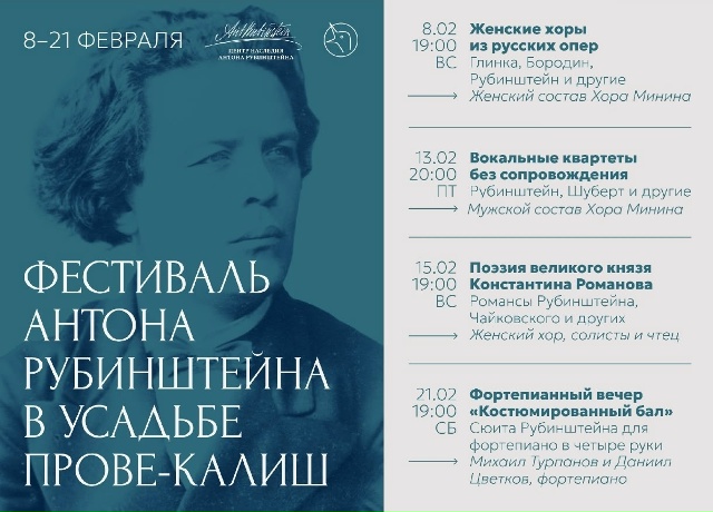 Первый Фестиваль Антона Рубинштейна в Усадьбе Прове-Калиш пройдёт в столице с 8 по 21 февраля. Цикл из четырёх концертов посвящён творчеству пианиста, композитора, дирижёра и педагога, основателя Русского музыкального общества (1859) и первой русской консерватории (1862, Петербург).