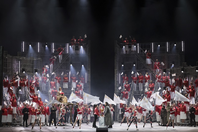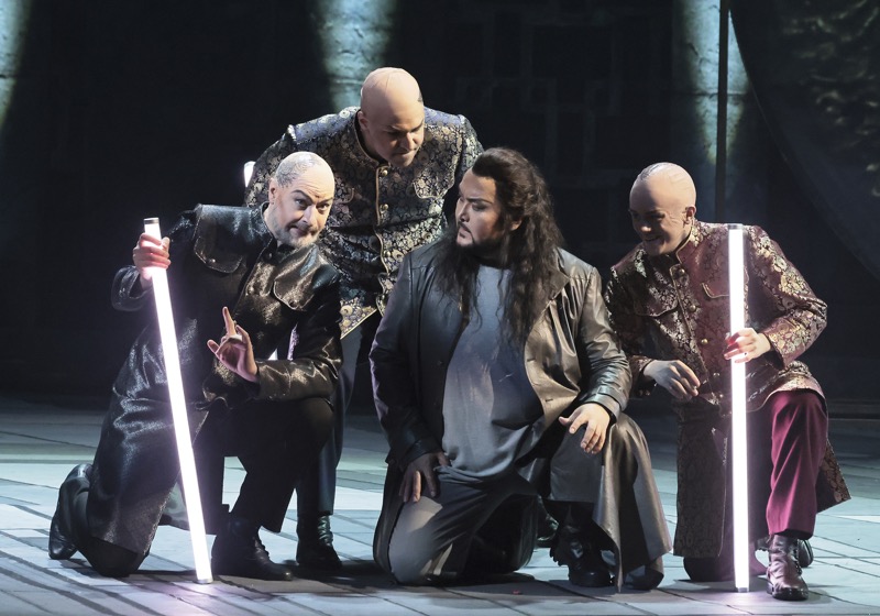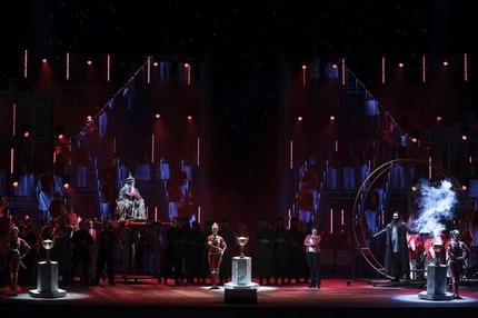 Восход Луны как олицетворение холодной неприступности, жестокой кровожадности Турандот и мимолетное появление абриса принцессы на небосклоне в виде ослепительной вспышки кометы – два равно притягательных для толпы народных наблюдателей события. Однако «апофеоз» ноктюрна первого акта – удар Калафа в состязательный гонг: удержать его от рокового безрассудства даже «пинпонги» – тройка министров императора Пинг, Панг и Понг – не в силах. А весьма неуклюжий и брутальный «праздник дня» – решенный в эстетике физкультурного парада второй акт, и ноги здесь как раз и растут из киношных ассоциаций и штампов «Голодных игр»…