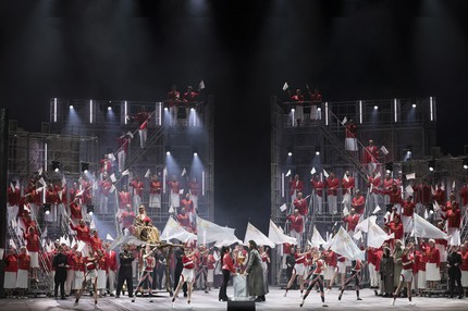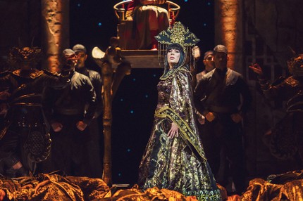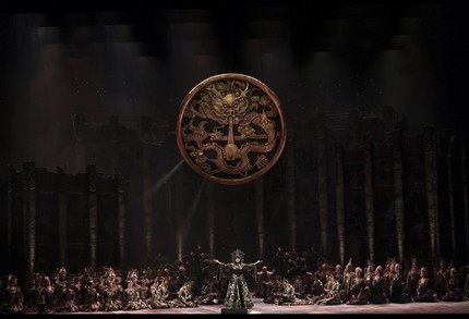 Премьера под управлением Тосканини состоялась в «Ла Скала» 25 апреля 1926 года через год и пять месяцев после смерти Пуччини, а финал Альфано впервые прозвучал лишь на втором спектакле, ибо первый Тосканини закончил в память о Пуччини без финала. Этот финал стал каноническим, и Большой театр и теперь, как и в 2002 году, вновь обратился к нему. Первый и практически весь третий акты (кроме «народного» финала-официоза со здравицами хора в честь якобы [к смыслу курсива вернемся позже] свадьбы принцессы Турандот и принца Калафа) выдержаны сейчас в единой ауре зловеще мрачного ноктюрна. И для этого все основания есть: в завораживающе тягостную, гнетущую, но впечатляюще зрелищную атмосферу казней, которым подвергаются претенденты на руку Турандот, не отгадавшие ее хитроумные загадки, мы попадаем сразу с открытием занавеса.