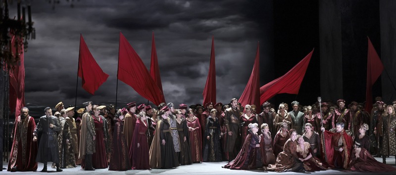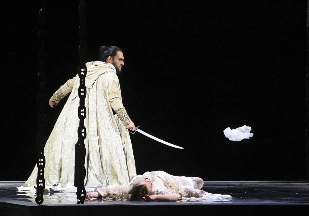 В финале экспликации режиссера читаем: «Избегая исторической контекстуализации, наша постановка, предлагает зрителю увидеть в “Отелло” не трагедию из далеких времен, а отражение окружающей нас действительности. Основной вопрос нашего “Отелло” – не где и когда происходит действие, а почему такие события повторяются вновь и вновь». Данный аспект, безусловно, важен, однако при таком подходе, говоря фигурально, вместе с водой неизбежно выплескивается и ребенок. Ребенок оперы с ее водой и вправду выплеснут, а в том, что в этой постановке в стиле нуар с не бог весть откуда взявшимися в ней красными флагами – явно цветовыми пятнами – осталось, сама трагедия Шекспира переосмыслена.