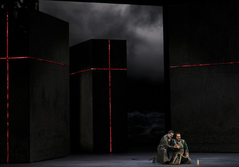Так почему же нынешняя премьера «Отелло» от Джанкарло Дель Монако в Большом выглядит странной? Вектор ее режиссерской направленности тянется не от весьма спорной, неоднозначной постановки «Риголетто» с реверансом в сторону режиссерской оперы, а от монументально-классической – пусть и шаблонно-формальной – «Аиды», основная гамма сценографии которой – черное, серое и «золотое». В «Аиде» аура романтизма ощущалась не только в сценографии, но и в стилизованных под эпоху сюжета костюмах, а в «Отелло» с абсолютно черной, абстрактной и намеренно вневременной сценографией весь романтизм исходит лишь от живописно-цветных (но под эпоху сюжета не стилизованных) костюмов.