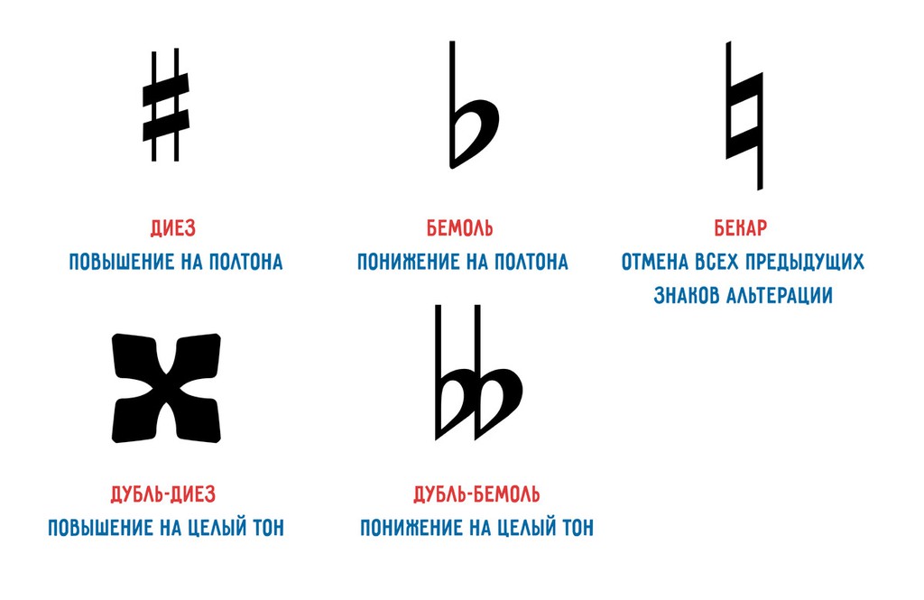 Латинское слово alterare означает изменять. В музыкальной науке альтерацией принято называть повышение или понижение звука, при котором название его не меняется. Любой звук можно повысить на полтона или тон, можно понизить на полтона или тон. В нотах это обозначается при помощи так называемых знаков альтерации.