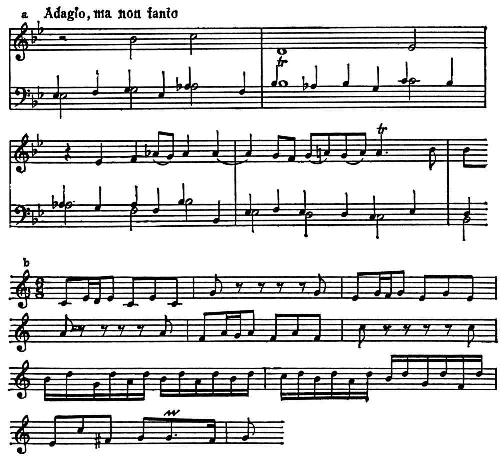 a) И. С. Бах. Бранденбургский концерт No 6, 2-я часть, тема с сопровождающими голосами.