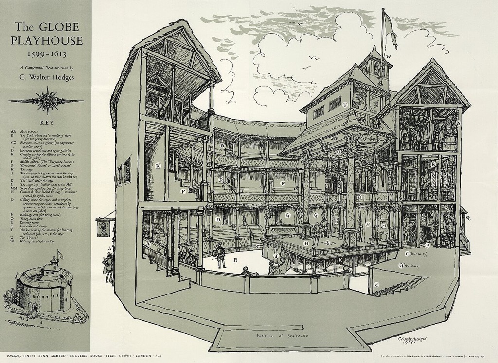 • Первоначальный театр «Глобус», построенный в 1599 году на средства труппы актёров «Слуги лорда-камергера», к которой принадлежал и Шекспир, и уничтоженный в результате пожара 29 июня 1613 года.