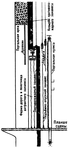 Современное театральное здание состоит из 2 основных частей — сцены и зрительного зала. Обе части отделены друг от друга капитальной, т. н. портальной, стеной. Общение между сценой и зрительным залом происходит через специальный проём в портальной стене, называемый портальным отверстием или портальной аркой. К оборудованию портальной арки (рис. 1) относятся следующие механизмы и приспособления: «арлекин», «козырёк» противопожарного занавеса с подвешенным к нему на ферме-дороге раздвижным антрактным занавесом, противопожарный занавес, подъёмно-опускной занавес, портальная падуга и портальные кулисы.
