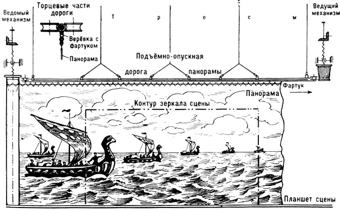 Часто в т-рах, особенно в драматических, панорамой принято называть и обычный подвешенный к штанге горизонт, т. е. белый или голубоватый задник (с радиусообразно загнутыми в сторону зрит. зала краями), необходимый для создания иллюзии большого пространства. На него же могут проецироваться облака, зарева пожарищ и др. эффекты. Большинство т-ров оборудовано механич. горизонтами, к-рые могут раскрываться и убираться. Механизмы горизонта устроены по принципу панорамных механизмов.