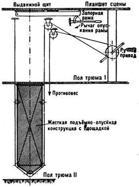 Планшет совр. сцены оборудуется разнообразными сценич. механизмами. Наиболее распространённым из них является поворотный круг (рис. 7), к-рый занимает почти всю игровую площадку. Круг является гл. принадлежностью сцены драм. т-ра. В оперно-балетном т-ре большее значение имеет подъёмно-опускной планшет с членением каждого плана на неск. отдельных подъёмно-опускных площадок (напр., 5 площадок на каждый план). Такое членение в сочетании с возможностью значит. подъёма площадок над уровнем планшета (+3 м) и опускания их ниже этого уровня (-3 м) позволяет создать на сцене любой рельеф. Каждая из подъёмно-опускных площадок должна иметь при этом дополнительные, меньших размеров, подъёмно-опускные площадки, а также люки провала (рис. 8). В последние годы широкое распространение получил подъёмно-опускной оркестр (рис. 9), который тоже состоит из ряда отдельных подъёмно- опускных площадок. Эти площадки могут подниматься все сразу, каждая в отдельности, а также в др. необходимых сочетаниях. Поднятые до уровня планшета сцены площадки увеличивают авансцену, выдвигают её вперёд, непосредственно к зрителю. Поднятые до уровня пола зрительного зала, они значительно увеличивают его размеры, приближая зрителя к сцене.