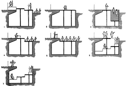 Рис. 9. Различные случаи использования подъёмно-опускного оркестра: 1) Подъёмно-опускные площадки оркестра ступенями поднимаются над оркестровым барьером. На авансцене — оркестр. Дирижёр и солисты приближены, к зрителям; 2) Подъёмно-опускные площадки подняты до уровня сцены. Солист приближен к зрителям; 3) Одна площадка поднята до уровня сцены. Другая опущена вниз. На ней установлена лестница, сообщающаяся со сценой; 4) Одна площадка — на уровне сцены. На ней — президиум собрания. Барьер оркестра снят. Вторая площадка — на уровне пола зрительного зала; 5) Обе площадки — на уровне пола зрительного зала. Докладчик — на авансцене; 6) Обе площадки — на уровне сцены. Центральная часть второй площадки опущена. На ней — дирижёр; 7) Обе площадки опущены. На них — большой оркестр для оперного спектакля