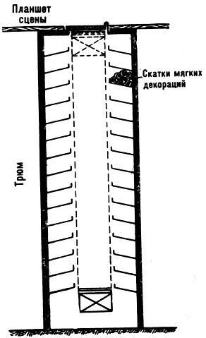 На арьерсцене в т-ре обычно устраивают специальные приспособления, к-рые называются сейфами (рис. 10) (находятся под настилом планшета, т. е. на уровне трюмов). Сейфы служат для хранения мягких живописных декораций в скатанном виде. Наиболее совершенным является тип сейфа Большого т-ра. Он состоит из семи подъёмно-опускных металлич. стеллажей, рядом расположенных и параллельных задней стене сцены; обычное положение стеллажей таково, что их крышки являются частью настила сцены. Каждый стеллаж, или, как его называют, кассета, имеет 5 закрывающихся полок, на них располагаются скатки мягких декораций. На специальной табличке, расположенной у пульта управления, указано, в какой кассете и на какой полке находится тот или иной спектакль. Машинный привод поднимает нужную полку до наиболее удобного для работы уровня.
