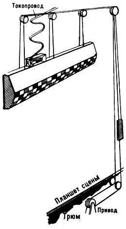 Между софитами во всю глубину сцены расположены декорационные, или штанкетные, подъёмы (рис. 4). Они служат для подвески и вертикального перемещения мягких живописных и др. декораций, расположенных параллельно портальной арке и друг другу. Штанкетные подъёмы могут быть использованы также для подвески полуобъёмных и отдельных объёмных декораций. К ним же подвешиваются и падуги. Штанкетные подъёмы представляют собой металлич. или деревянную штангу, превышающую по своей длине ширину зеркала сцены и перемещающуюся между колосниковой решёткой и планшетом сцены с регулируемой в широких пределах (от минимальной до 1,6 м/сек) скоростью. При достижении крайнего верхнего и крайнего нижнего рабочих положений штанга автоматически останавливается. Расстояние между осями двух соседних штанг равняется обычно 200 мм. Подвешивается штанга к стальным канатам.