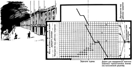 Рис. 5а. Система индивидуальных подъёмов (план колосников) и пример перспективной подвески живописной декорации