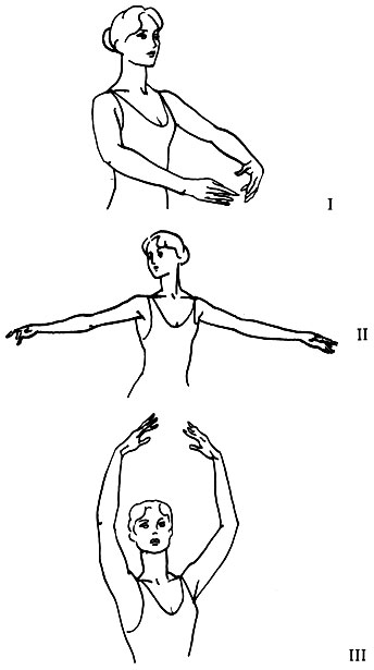 Франц. и довагановская русская школы пользовались семью позициями рук, исполняемыми в закруглённом (arrondi) и удлинённом (allonge) виде. Ваганова же предложила три осн. П. и подготовительное положение к ним. Подготовительная П. — опущенные вниз руки округлены в локтях и кистях, слегка отделены от корпуса; I — округлённые руки подняты на уровне диафрагмы; II — разведены в стороны на уровне плеч; III — подняты над головой. Из осн. П. образуется множество производных положений.