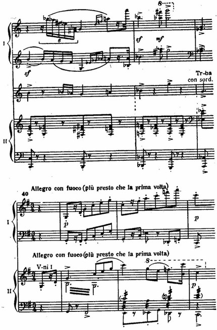 В завершении первой части, не лишенной признаков мозаичности, вслед за веселой гротескной эксцентриадой (реприза главной партии) звучат мощные гирлянды аккордов фортепиано и оркестра (con precisione), как бы в соперничестве наскакивающие друг на друга.
